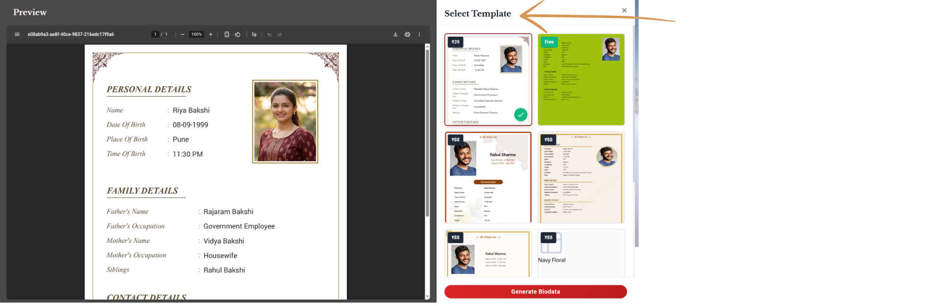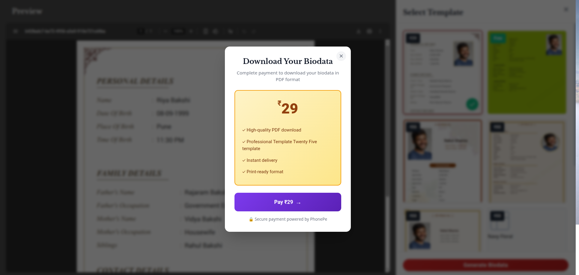 Your biodata is generated as a high-quality PDF, ready to download instantly. Share it via WhatsApp, email, or print it for in-person meetings. Congratulations!